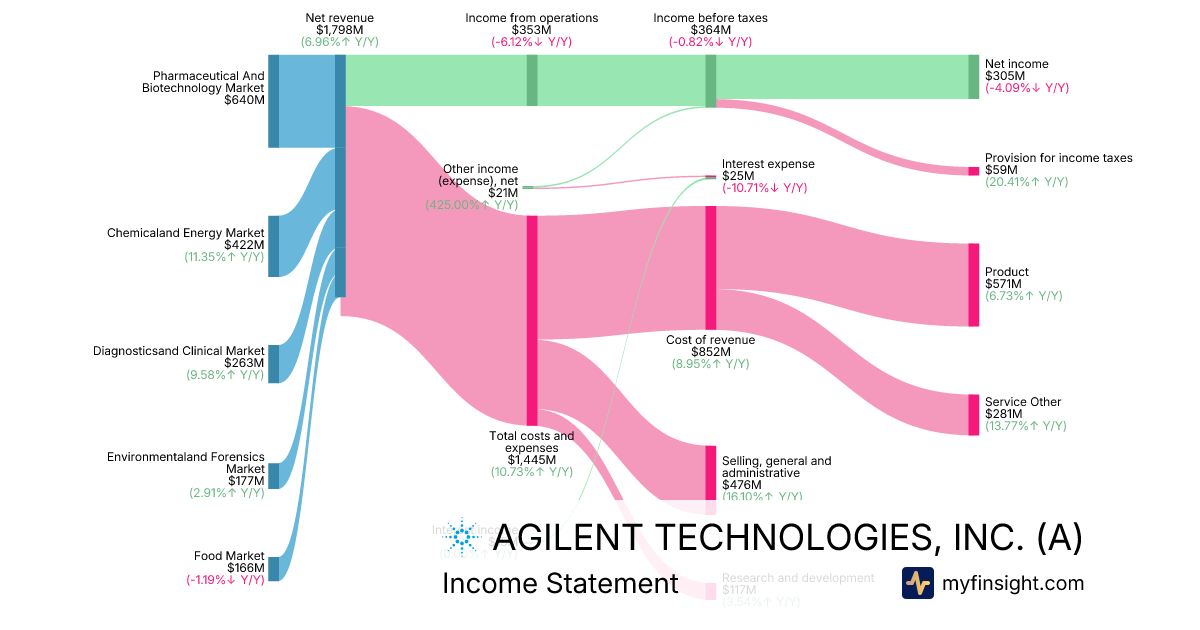 For the quarter ending 2026-01-31, A made $1,798M in revenue. $305M in net income. Net profit margin of 16.96%.