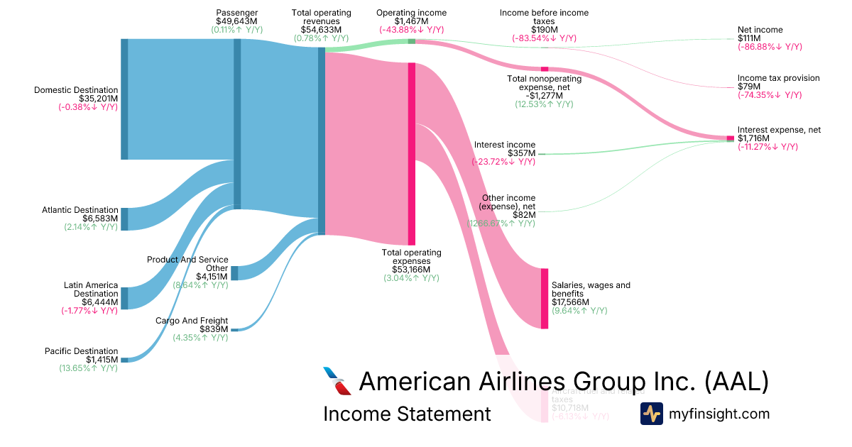 For the year ending 2025-12-31, AAL made $54,633M in revenue. $111M in net income. Net profit margin of 0.20%.
