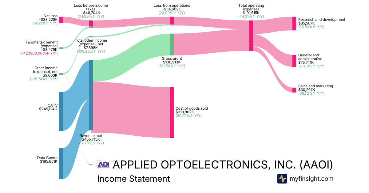For the year ending 2025-12-31, AAOI made $455,715K in revenue. -$38,228K in net income. Net profit margin of -8.39%.