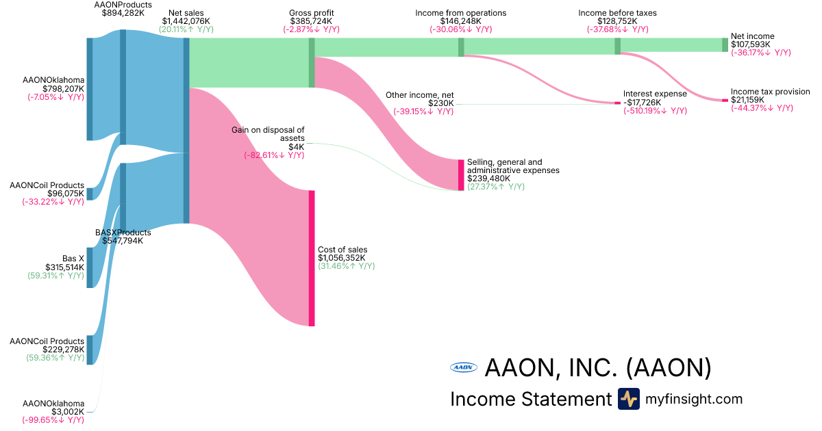 For the year ending 2025-12-31, AAON made $1,442,076K in revenue. $107,593K in net income. Net profit margin of 7.46%.