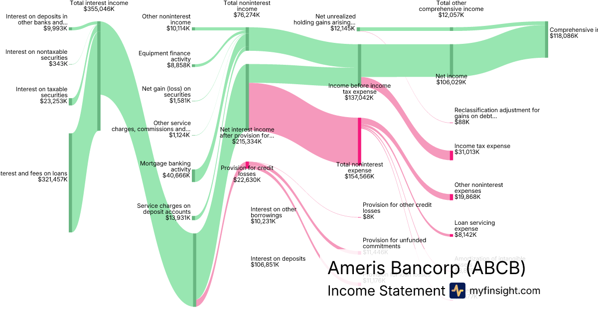 For the quarter ending 2025-09-30, ABCB made $737,743K in revenue. $118,086K in net income. Net profit margin of 16.01%.