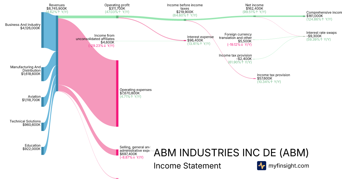 For the year ending 2025-10-31, ABM made $8,745,900K in revenue. $161,000K in net income. Net profit margin of 1.84%.