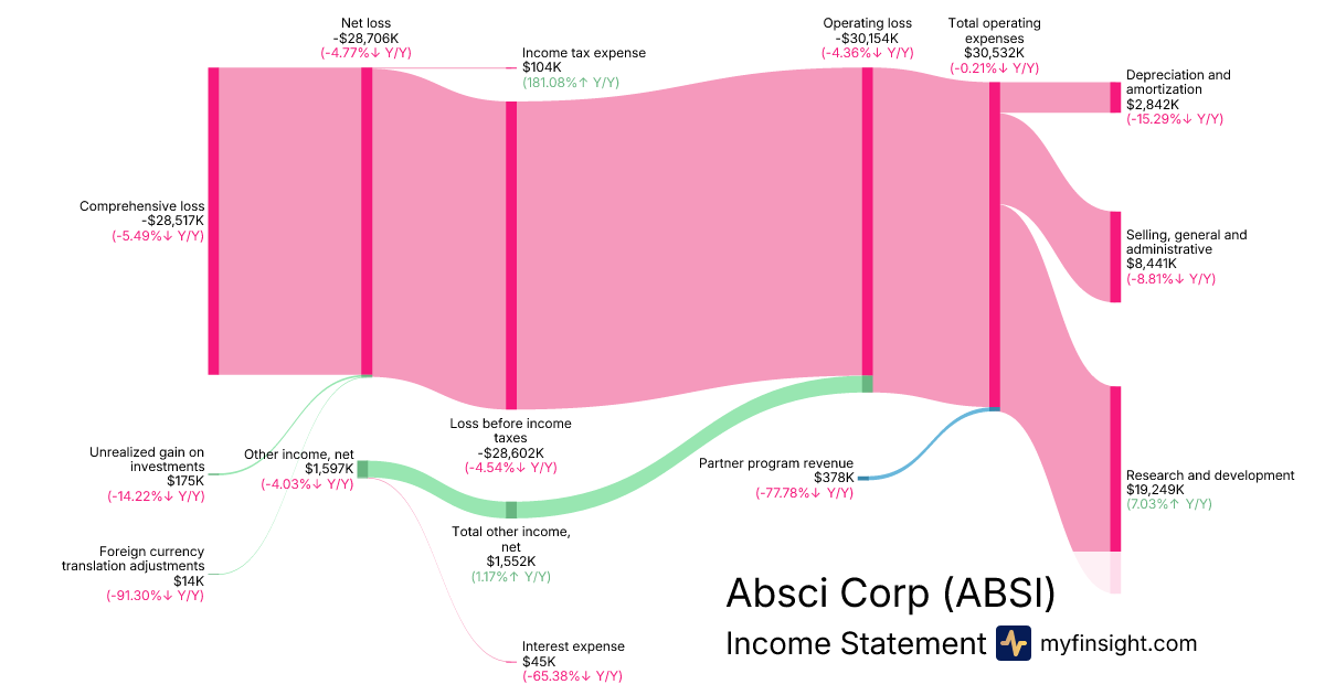 For the quarter ending 2025-09-30, ABSI made $378K in revenue. -$28,517K in net income. Net profit margin of -7544.18%.