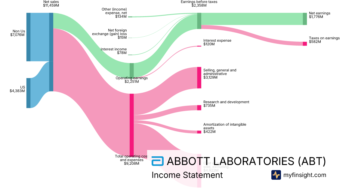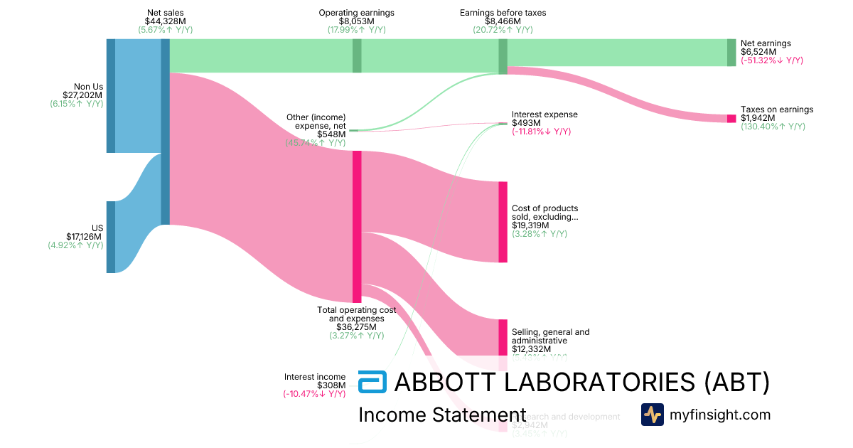 For the year ending 2025-12-31, ABT made $44,328M in revenue. $6,524M in net income. Net profit margin of 14.72%.