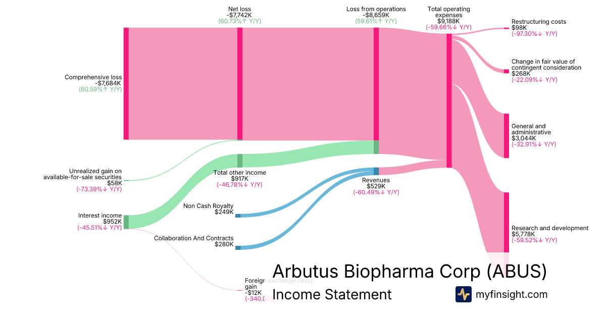 For the quarter ending 2025-09-30, ABUS made $529,000 in revenue. -$7,684,000 in net income. Net profit margin of -1452.55%.