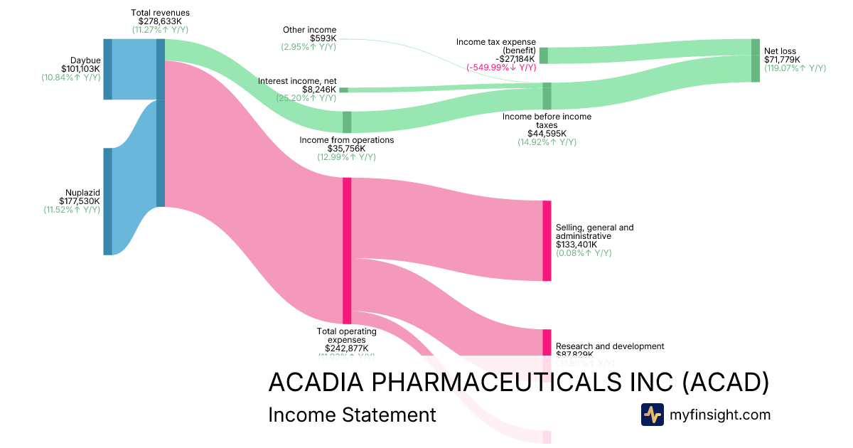 For the quarter ending 2025-09-30, ACAD made $278,633K in revenue. $71,779K in net income. Net profit margin of 25.76%.