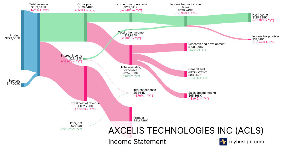 For the year ending 2025-12-31, ACLS made $839,048K in revenue. $120,238K in net income. Net profit margin of 14.33%.