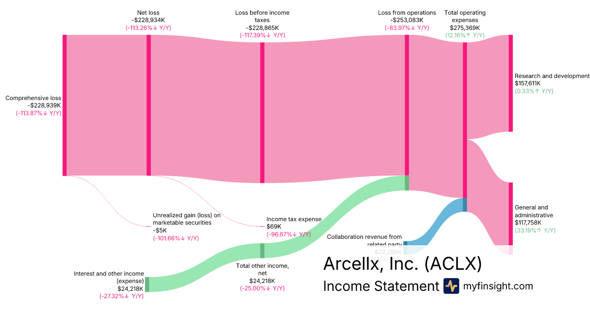 For the year ending 2025-12-31, ACLX made $22,286K in revenue. -$228,939K in net income. Net profit margin of -1027.28%.
