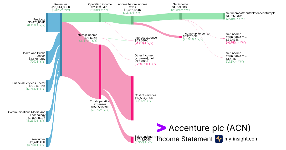 For the quarter ending 2026-02-28, ACN made $18,044,066K in revenue. $1,825,239K in net income. Net profit margin of 10.12%.
