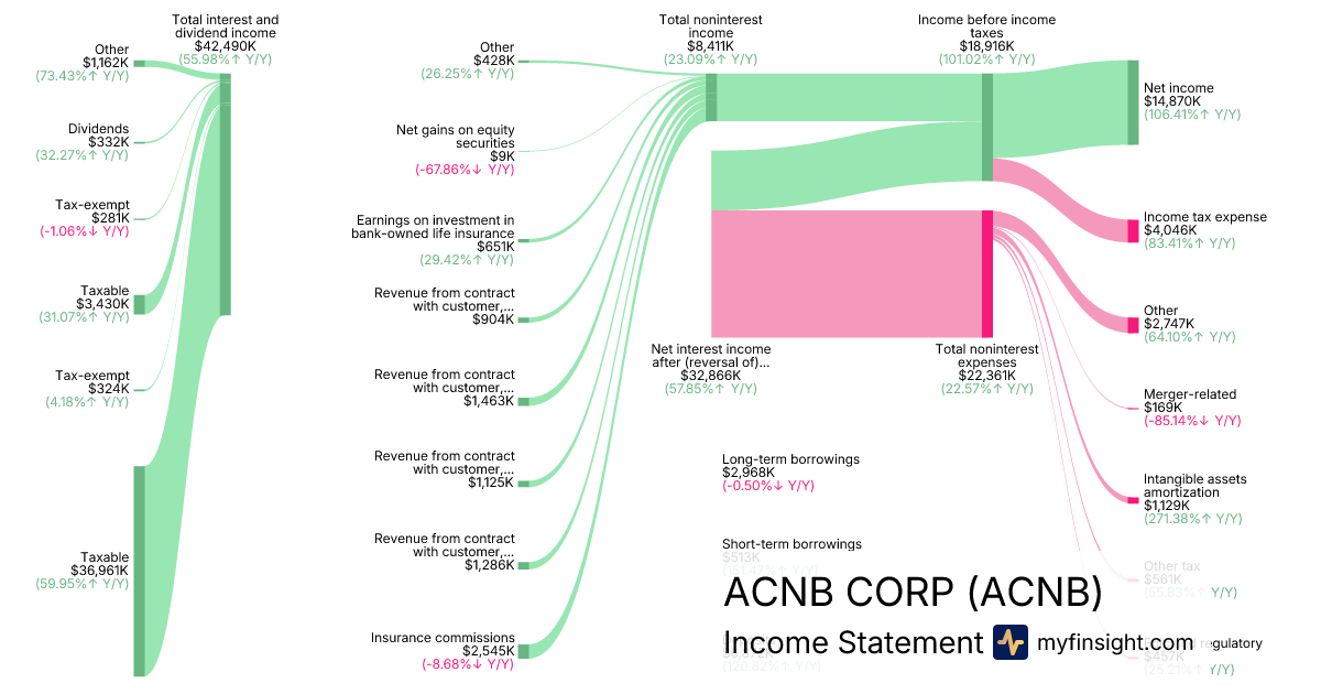 For the quarter ending 2025-09-30, ACNB made $82,886K in revenue. $14,870K in net income. Net profit margin of 17.94%.