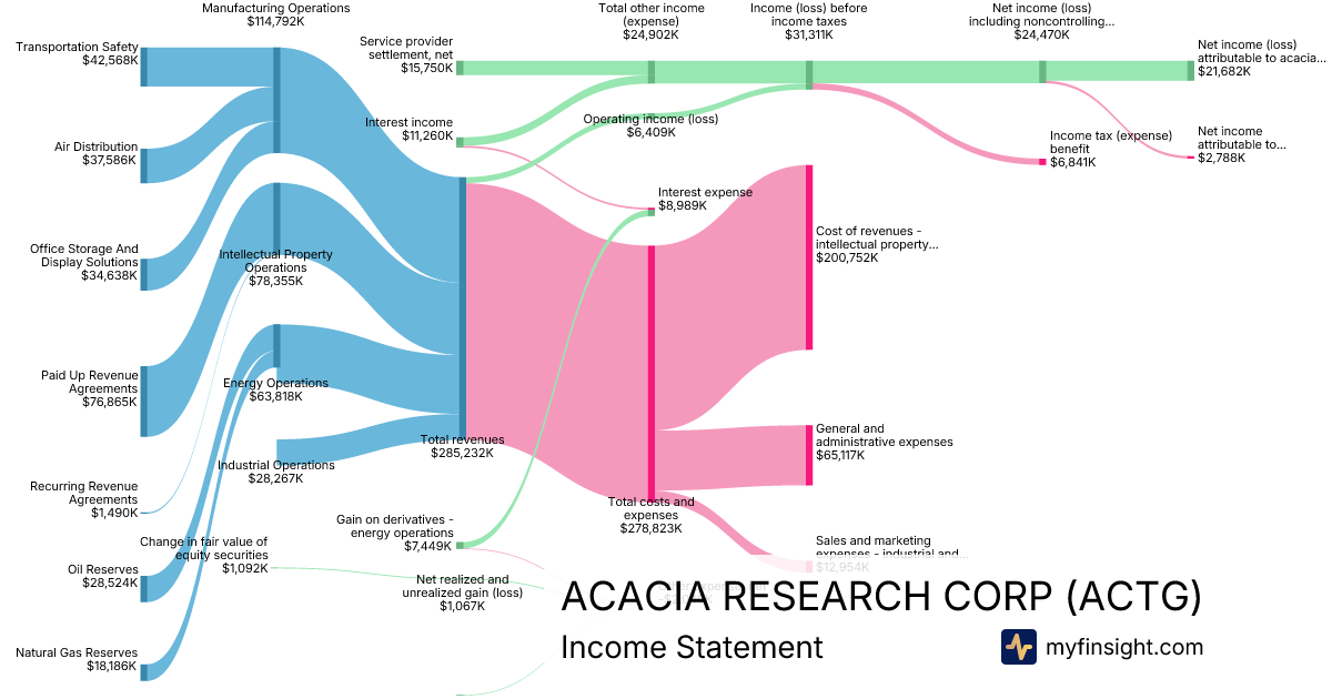 For the year ending 2025-12-31, ACTG made $285,232K in revenue. $21,682K in net income. Net profit margin of 7.60%.
