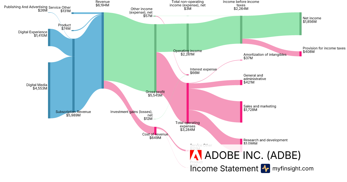 For the year ending 2025-11-28, ADBE made $23,769M in revenue. $7,130M in net income. Net profit margin of 30.00%.