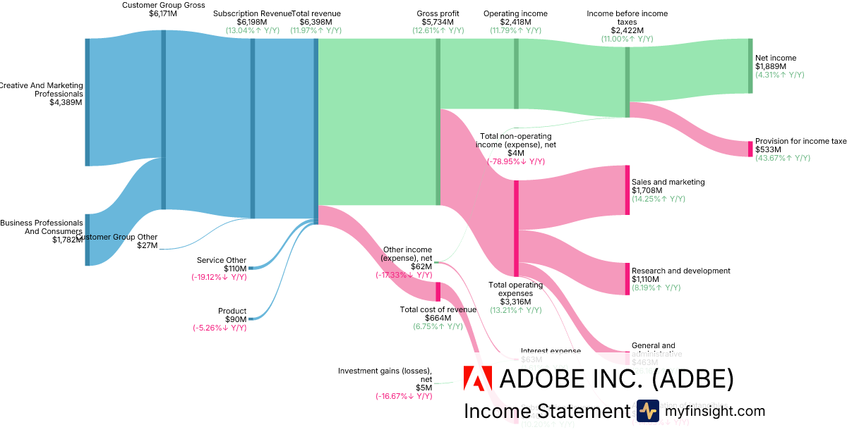 For the quarter ending 2026-02-27, ADBE made $6,398M in revenue. $1,889M in net income. Net profit margin of 29.52%.