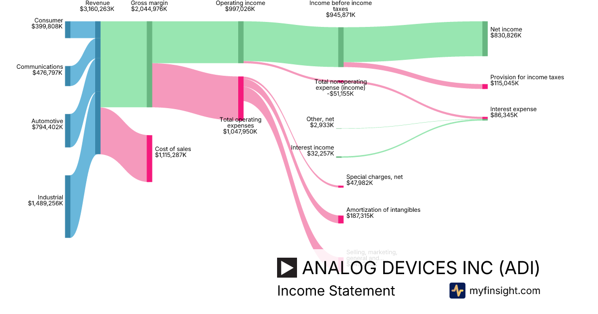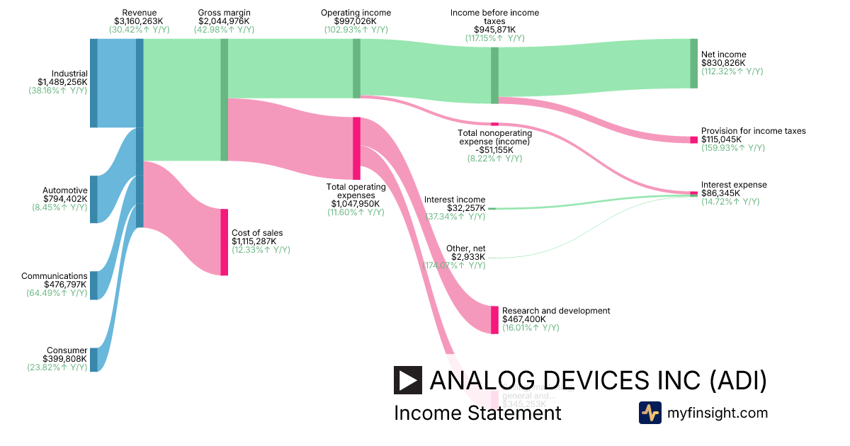 For the quarter ending 2026-01-31, ADI made $3,160,263K in revenue. $830,826K in net income. Net profit margin of 26.29%.