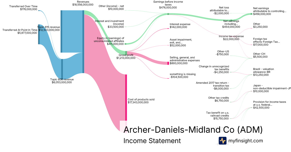For the year ending 2025-12-31, ADM made $80,269M in revenue. $1,078M in net income. Net profit margin of 1.34%.