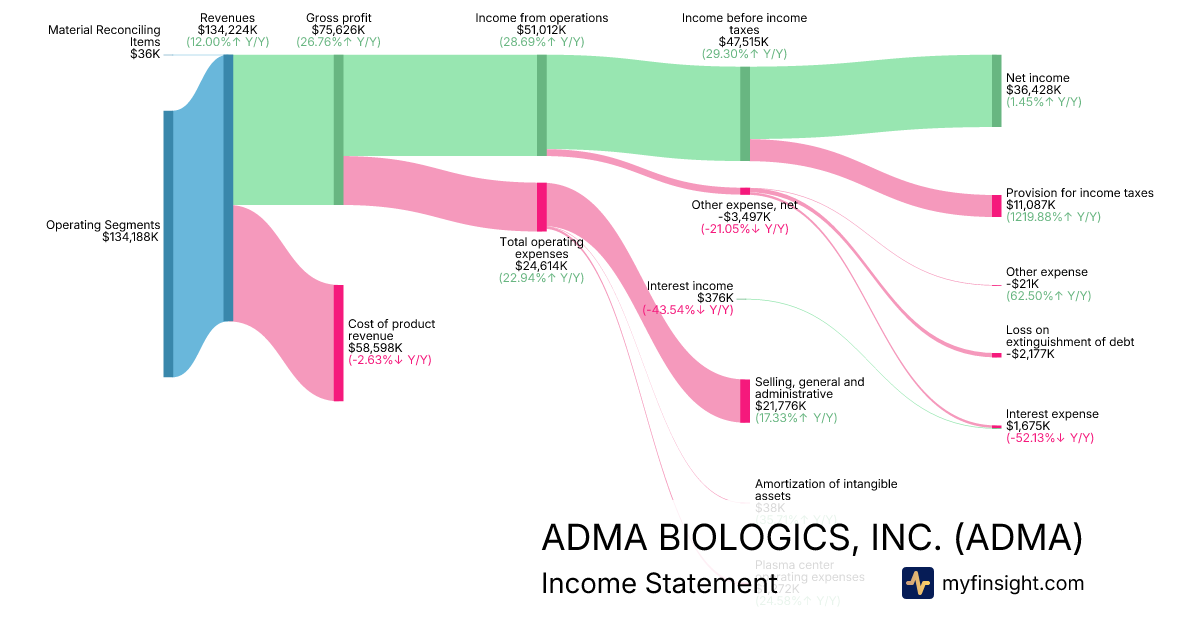For the quarter ending 2025-09-30, ADMA made $134,224K in revenue. $36,428K in net income. Net profit margin of 27.14%.