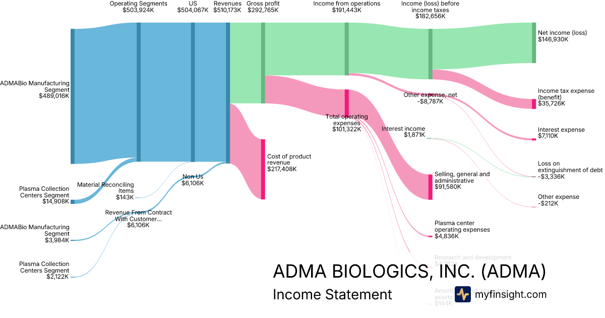 For the year ending 2025-12-31, ADMA made $510,173K in revenue. $146,930K in net income. Net profit margin of 28.80%.