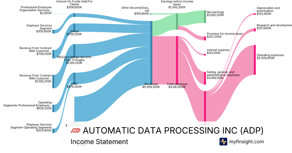 For the quarter ending 2025-12-31, ADP made $5,359,300K in revenue. $1,062,000K in net income. Net profit margin of 19.82%.