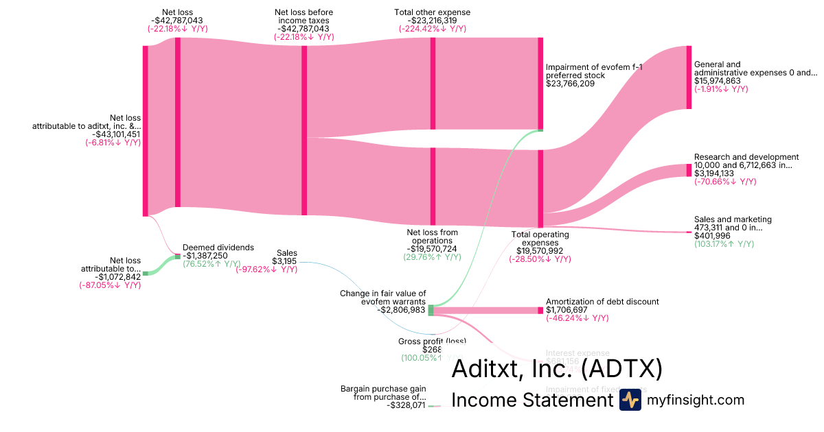 For the year ending 2025-12-31, ADTX made $3,195 in revenue. -$43,101,451 in net income. Net profit margin of -1349028.20%.