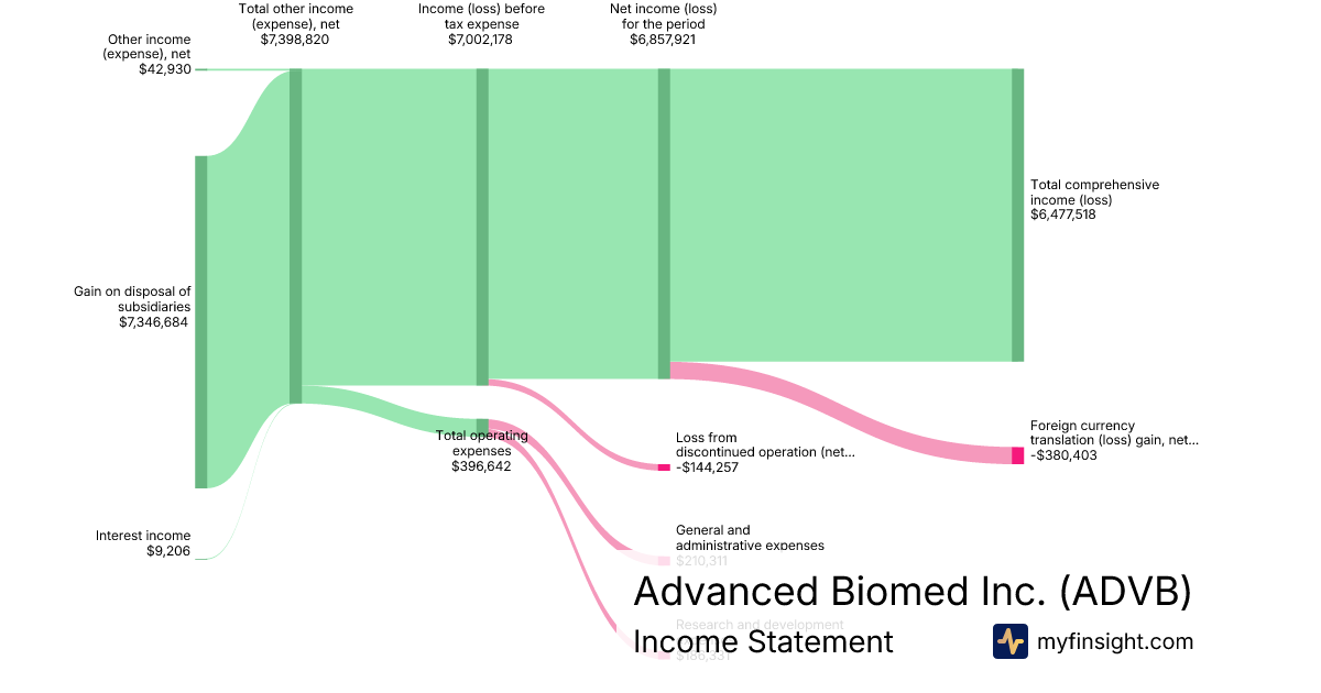 For the quarter ending 2025-12-31, ADVB made $7,795,462 in revenue. $6,477,518 in net income. Net profit margin of 83.09%.
