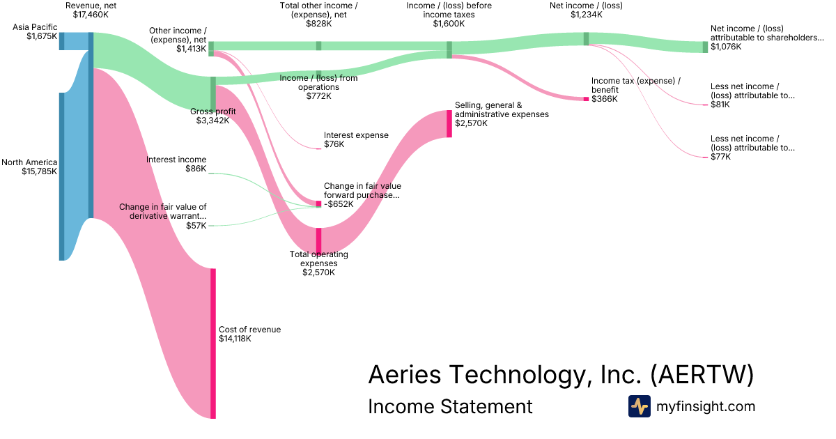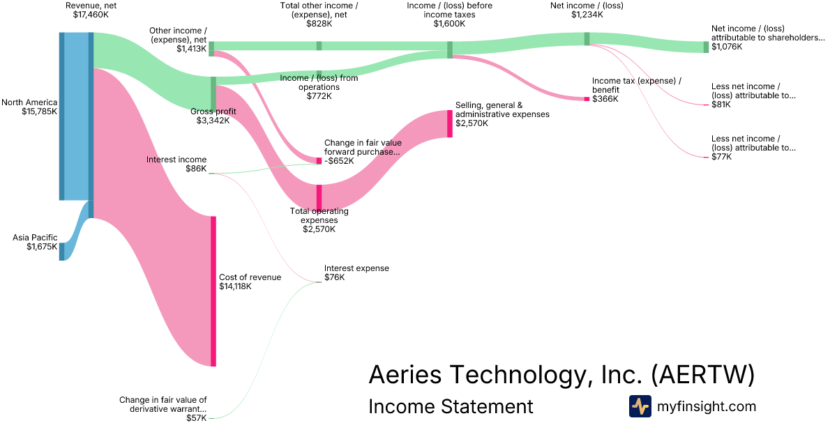 For the quarter ending 2025-12-31, AERTW made $17,460K in revenue. $1,076K in net income. Net profit margin of 6.16%.