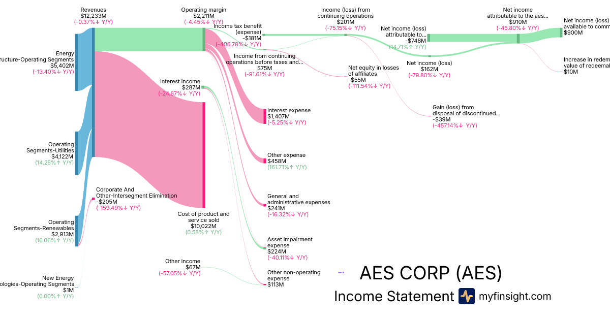 For the year ending 2025-12-31, AES made $12,233M in revenue. $900M in net income. Net profit margin of 7.36%.