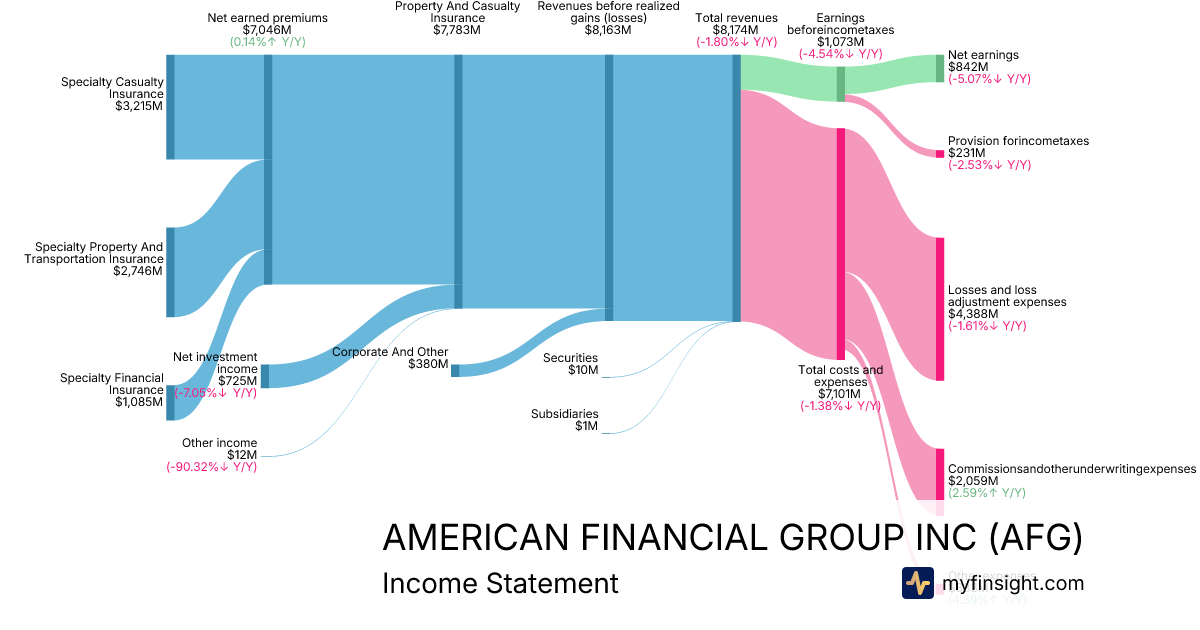 For the year ending 2025-12-31, AFG made $8,174M in revenue. $842M in net income. Net profit margin of 10.30%.