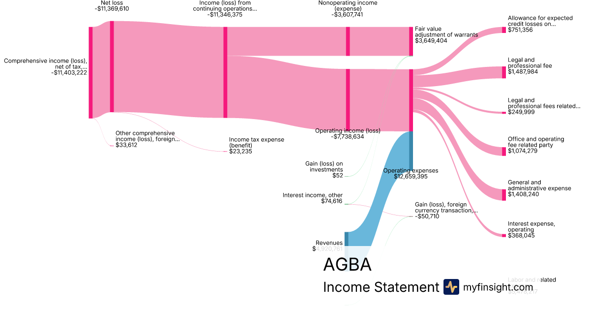 For the quarter ending 2024-06-30, AGBA made $4,920,761 in revenue. -$11,403,222 in net income. Net profit margin of -231.74%.