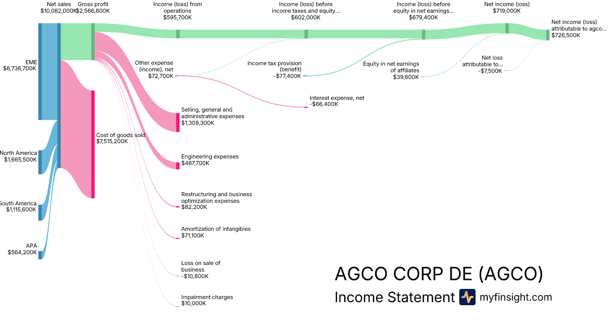 For the year ending 2025-12-31, AGCO made $10,082,000K in revenue. $726,500K in net income. Net profit margin of 7.21%.