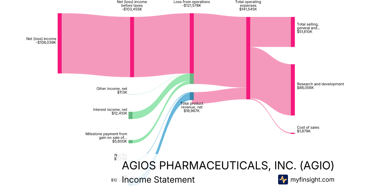 For the year ending 2025-12-31, AGIO made $54,028K in revenue. -$412,781K in net income. Net profit margin of -764.01%.