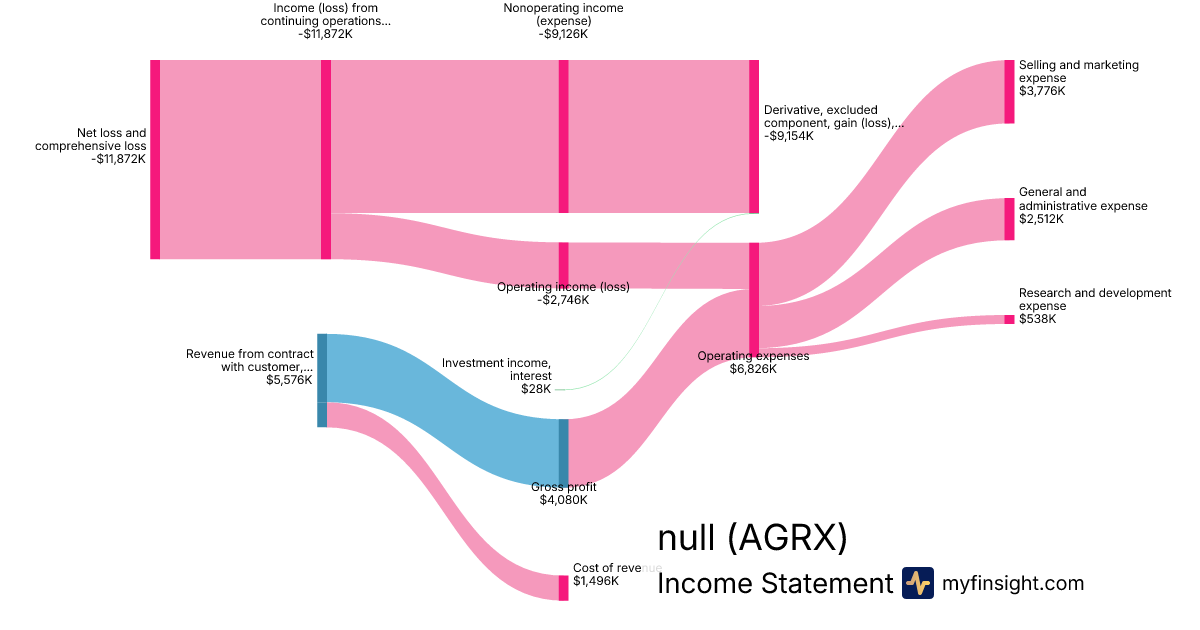 For the quarter ending 2024-06-30, AGRX made $5,576K in revenue. -$11,872K in net income. Net profit margin of -212.91%.