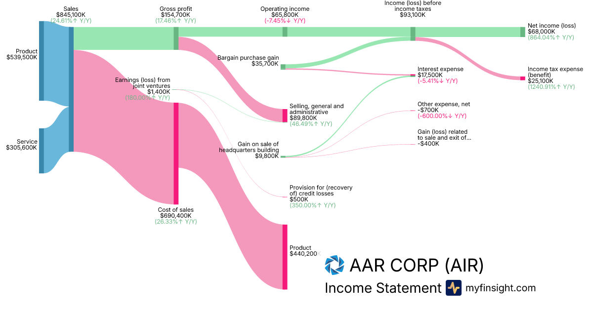For the quarter ending 2026-02-28, AIR made $845,100K in revenue. $68,000K in net income. Net profit margin of 8.05%.