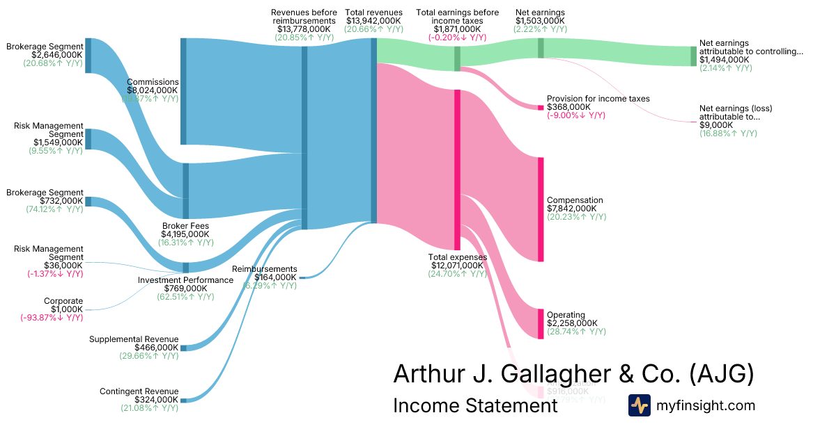 For the year ending 2025-12-31, AJG made $13,942,000K in revenue. $1,494,000K in net income. Net profit margin of 10.72%.