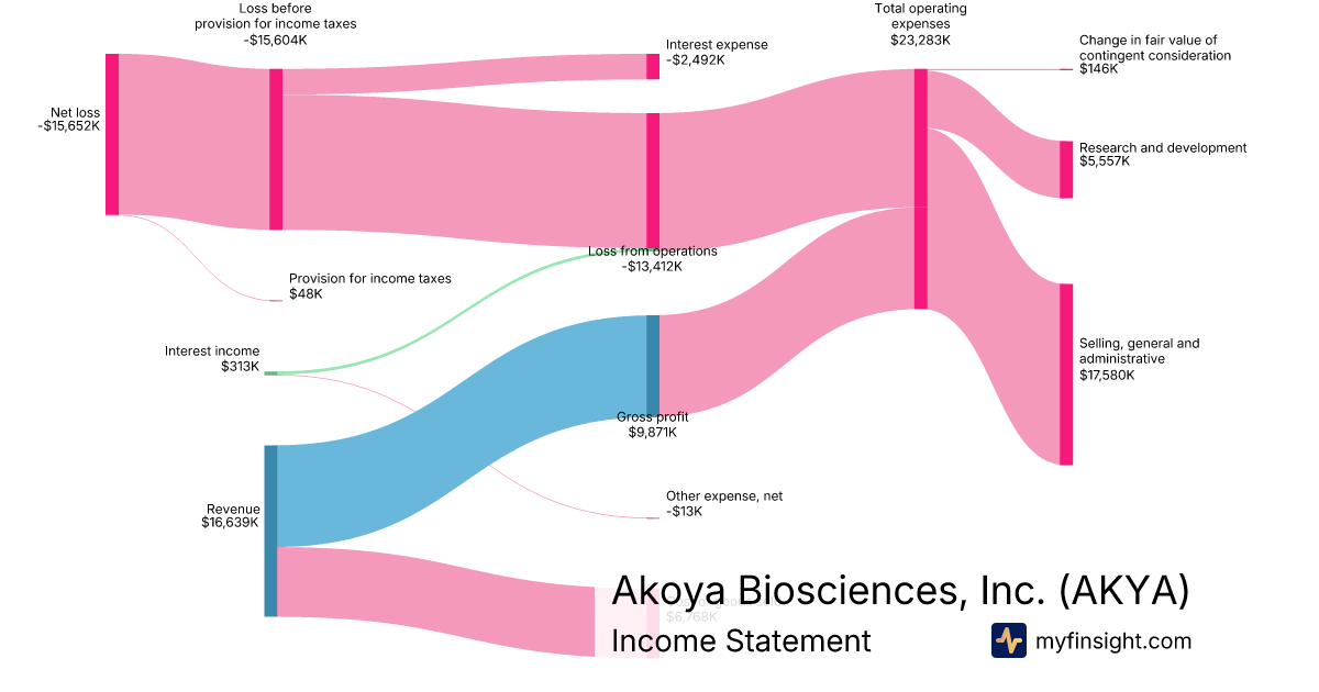 For the quarter ending 2025-03-31, AKYA made $16,639K in revenue. -$15,652K in net income. Net profit margin of -94.07%.