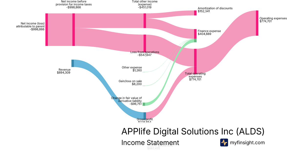For the quarter ending 2025-12-31, ALDS made $894,309 in revenue. -$998,866 in net income. Net profit margin of -111.69%.