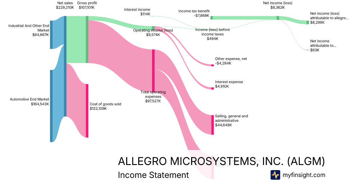 For the quarter ending 2025-12-26, ALGM made $229,210K in revenue. $8,299K in net income. Net profit margin of 3.62%.