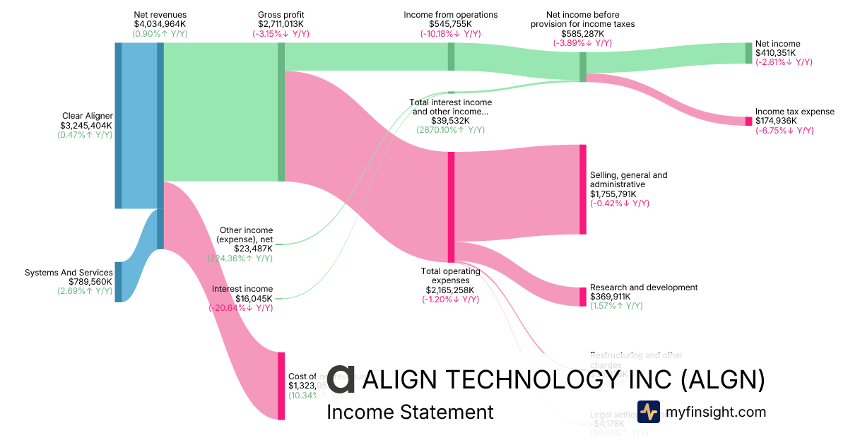 For the year ending 2025-12-31, ALGN made $4,034,964K in revenue. $410,351K in net income. Net profit margin of 10.17%.