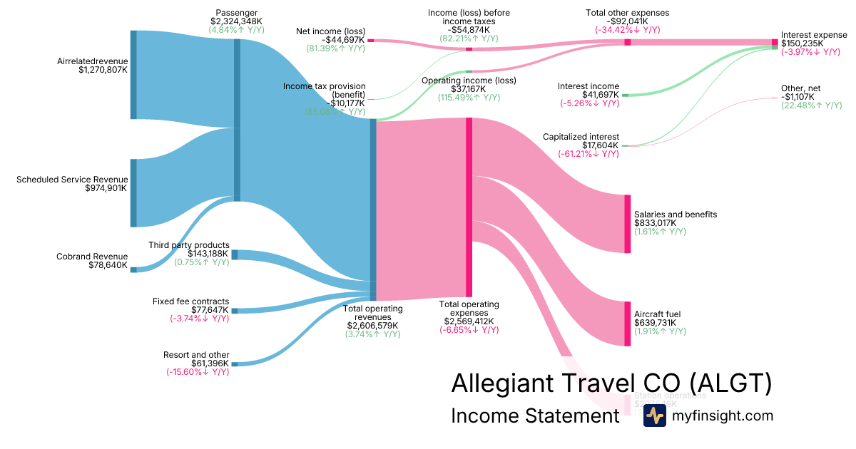 For the year ending 2025-12-31, ALGT made $2,606,579K in revenue. -$44,697K in net income. Net profit margin of -1.71%.