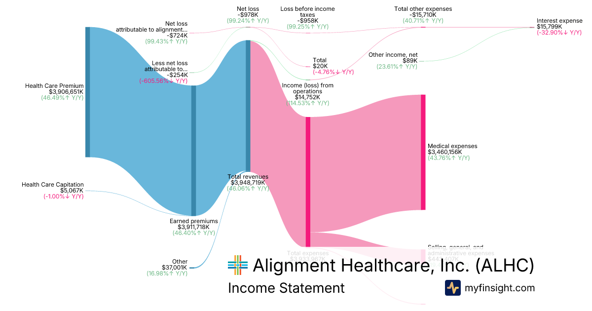 For the year ending 2025-12-31, ALHC made $3,948,719K in revenue. -$724K in net income. Net profit margin of -0.02%.