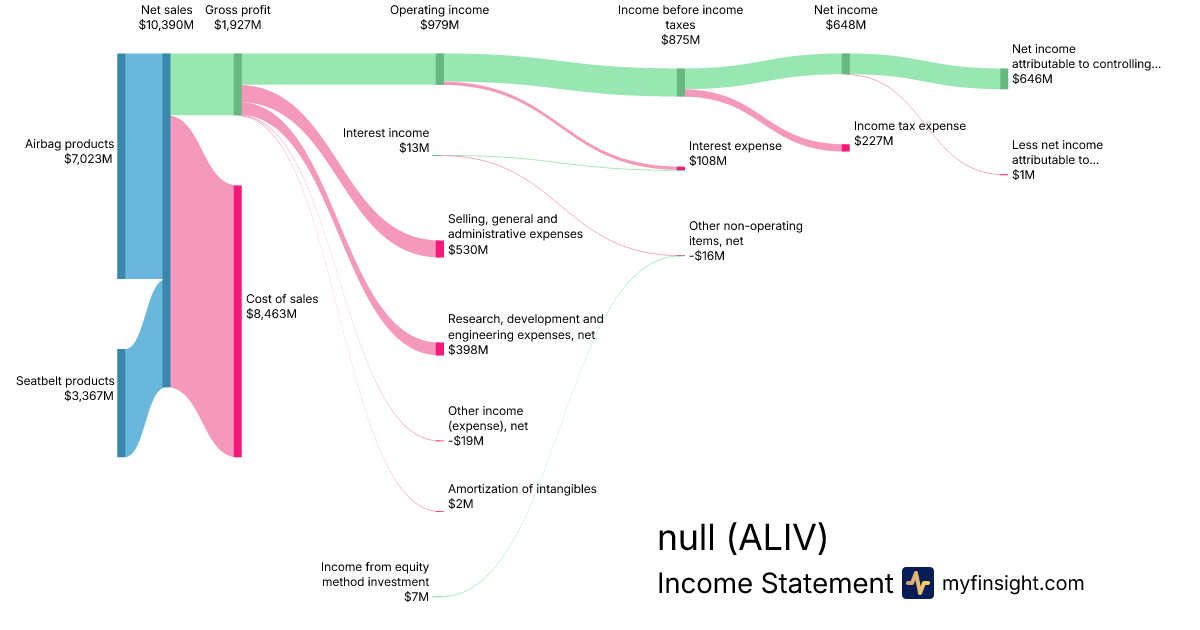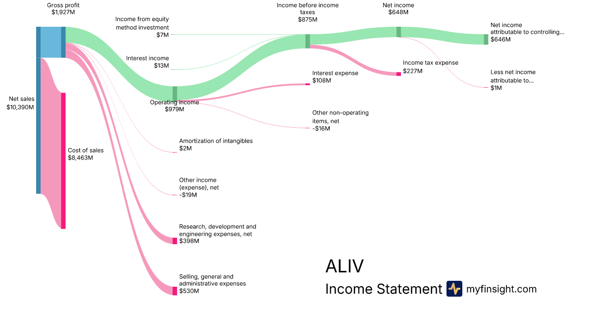 For the year ending 2024-12-31, ALIV made $10,390M in revenue. $646M in net income. Net profit margin of 6.22%.