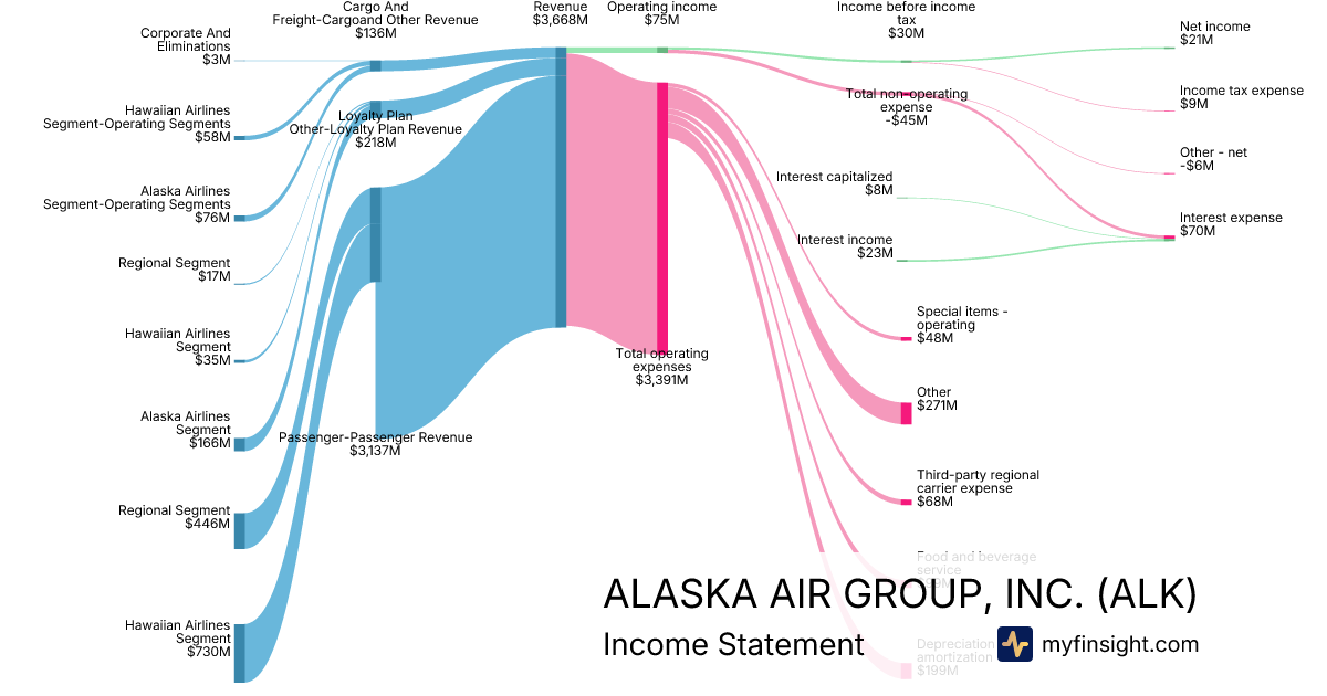 For the year ending 2025-12-31, ALK made $14,239M in revenue. $100M in net income. Net profit margin of 0.70%.
