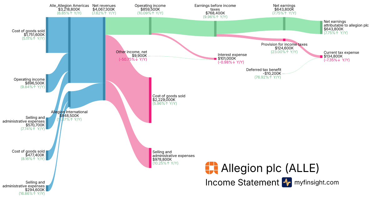 For the year ending 2025-12-31, ALLE made $4,067,300K in revenue. $643,800K in net income. Net profit margin of 15.83%.