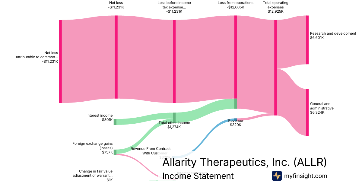 For the year ending 2025-12-31, ALLR made $320K in revenue. -$11,231K in net income. Net profit margin of -3509.69%.