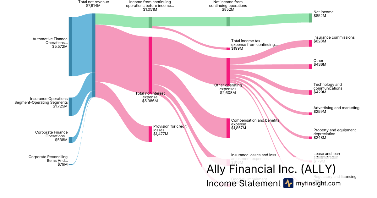For the year ending 2025-12-31, ALLY made $7,914M in revenue. $852M in net income. Net profit margin of 10.77%.