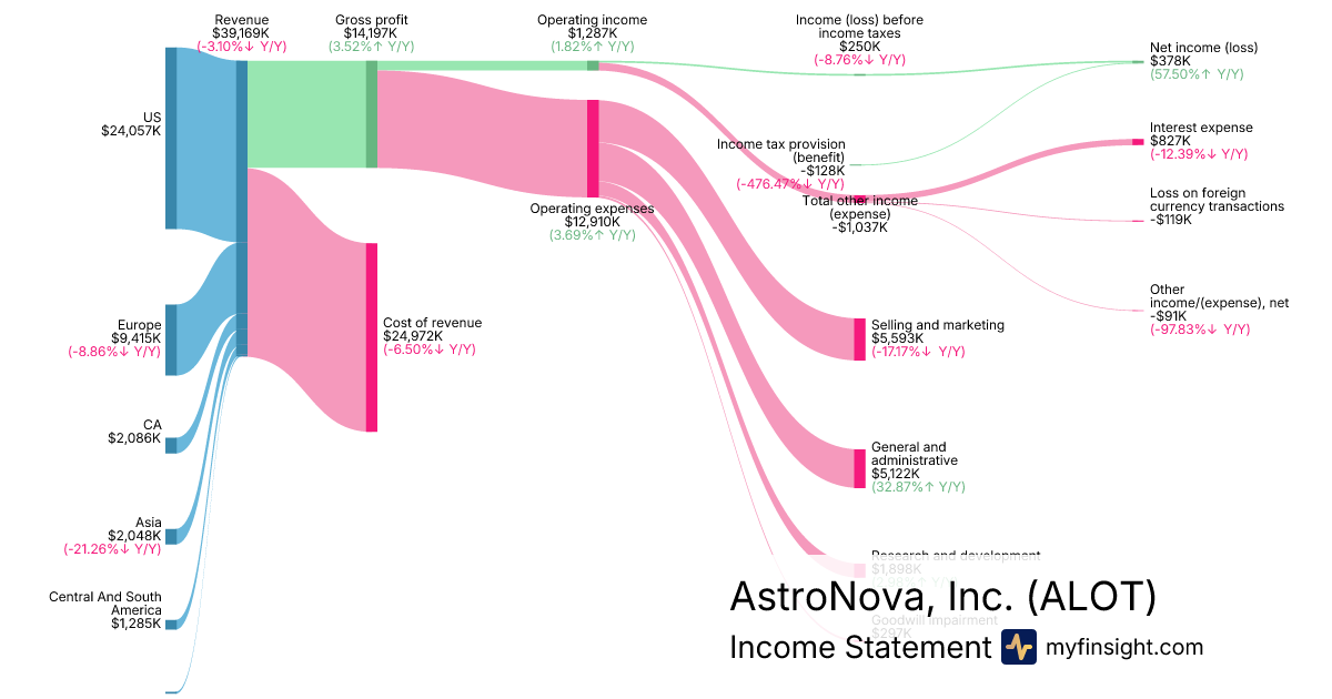 For the quarter ending 2025-10-31, ALOT made $39,169K in revenue. $378K in net income. Net profit margin of 0.97%.