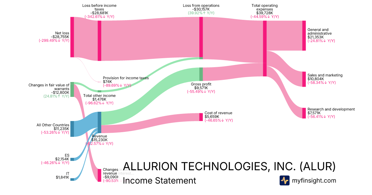 For the year ending 2025-12-31, ALUR made $15,230K in revenue. -$28,755K in net income. Net profit margin of -188.80%.
