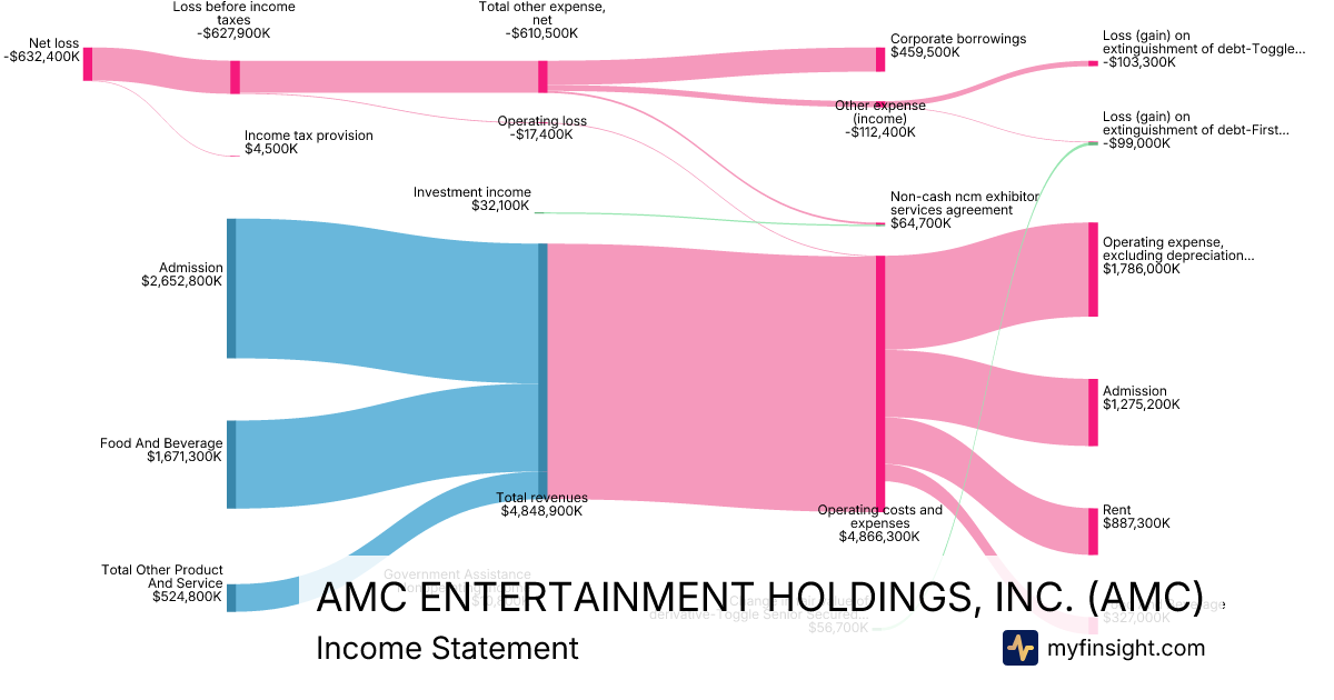 For the year ending 2025-12-31, AMC made $4,848,900K in revenue. -$632,400K in net income. Net profit margin of -13.04%.