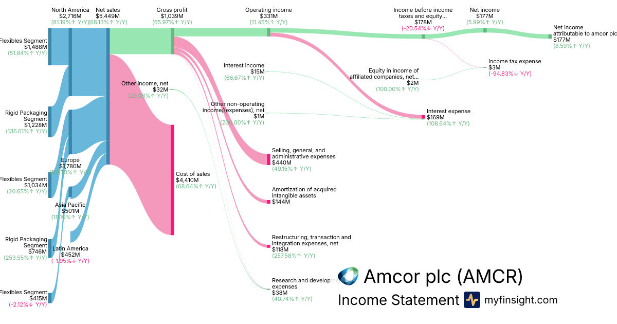 For the quarter ending 2025-12-31, AMCR made $5,449M in revenue. $177M in net income. Net profit margin of 3.25%.