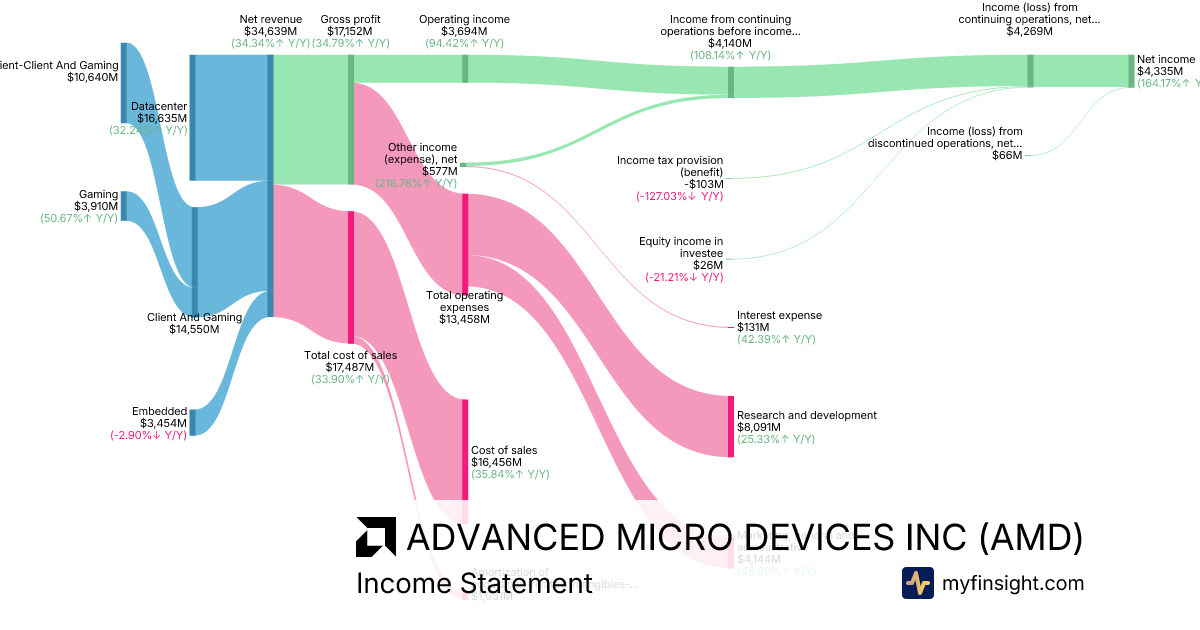 For the year ending 2025-12-27, AMD made $34,639M in revenue. $4,335M in net income. Net profit margin of 12.51%.