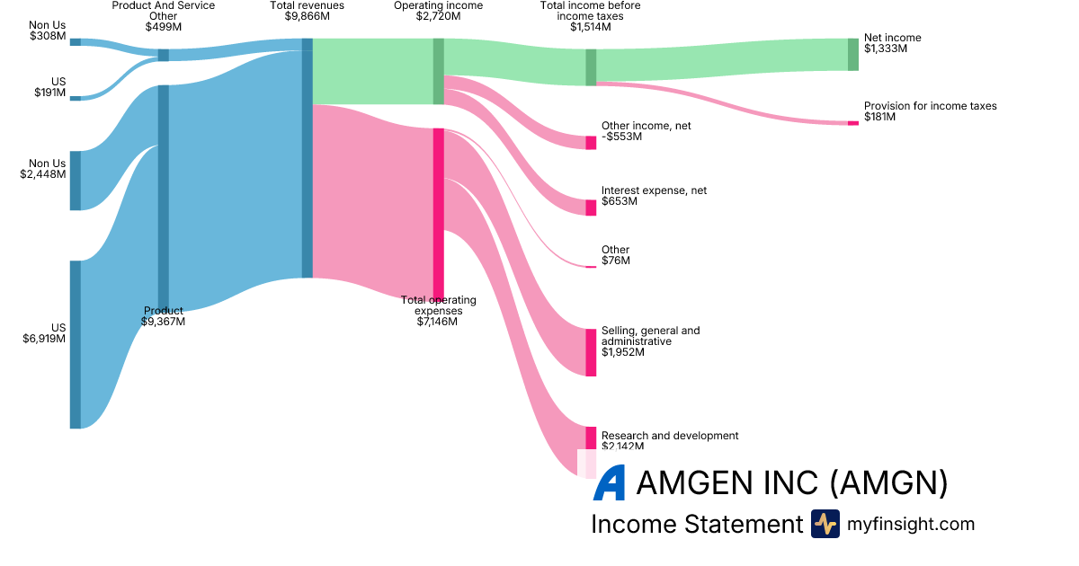 For the year ending 2025-12-31, AMGN made $36,751M in revenue. $7,711M in net income. Net profit margin of 20.98%.